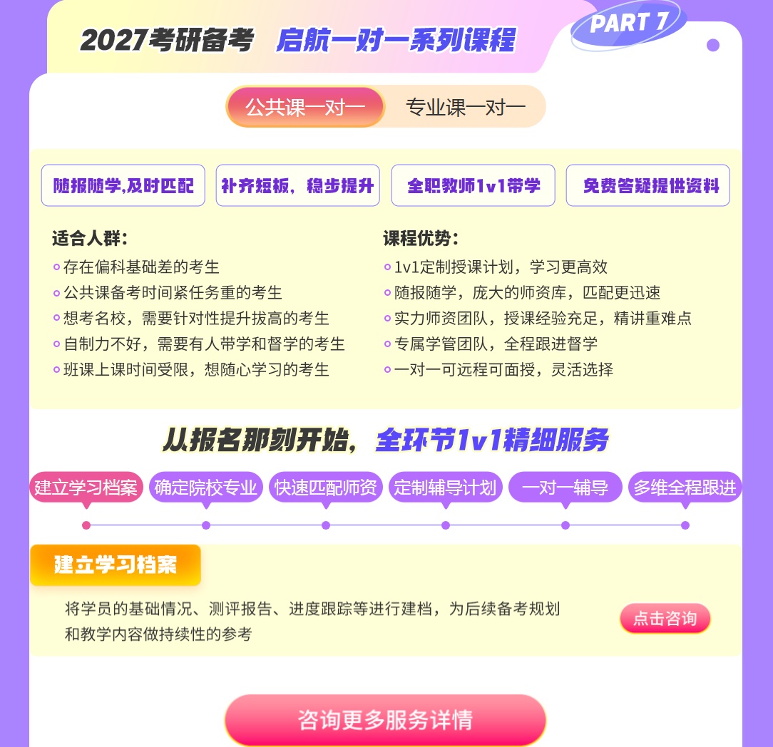 从报名那刻开始,全环节1v1精细服务,建立学习档案,确定院校专业,匹配师资,定制辅导计划,一对一辅导,多维全程跟进,将学员的基础情况、测评报告、进度跟踪等进行建档,为后续备考规划和教学内容做持续性的参考